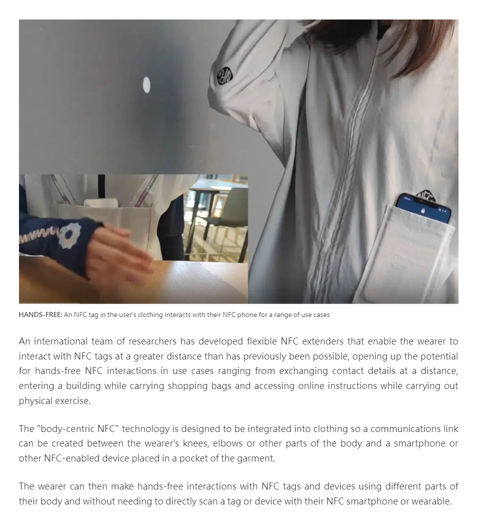 Researchers develop NFC extenders that can be built into clothing to enable hands-free NFC interactions at a distance